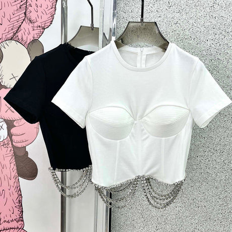 French Heavy Industry Rhinestone Side Three-dimensional Tailoring Is Thin And Short-sleeved Women